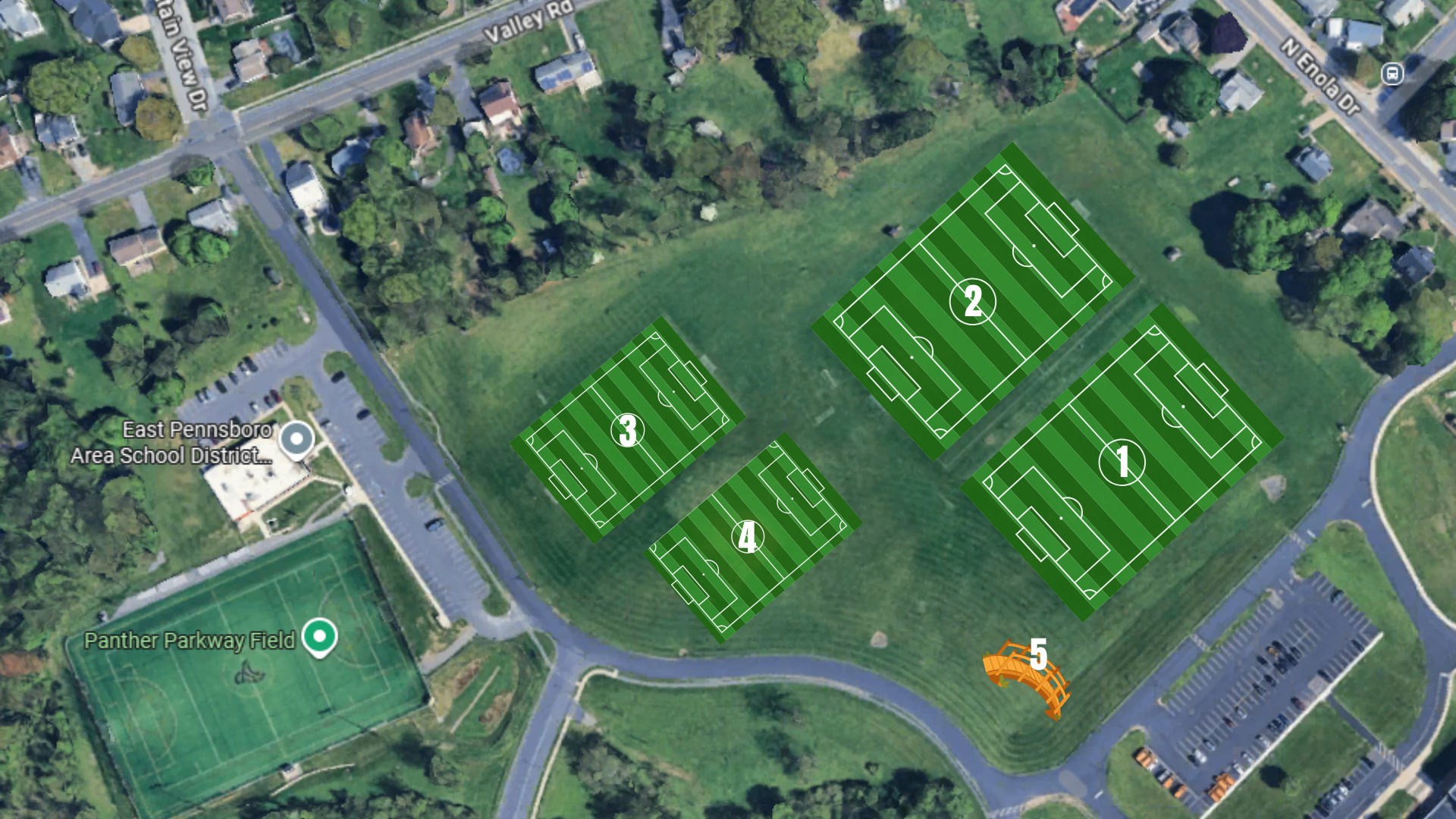 The site map identifies numbered areas across the East Pennsboro fields: